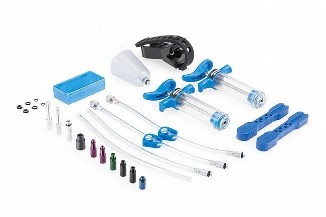 The Park Tool BKM-1 Hydraulic Mineral Oil Bleed Kit will bleed most models of mineral oil-based hydraulic brakes. Hydraulic systems need bleeding to remove any air bubbles and to inject new, clean fluid. The Park Tool BKM-1 Bleed Kit has been designed and built for home use and for the rigors of daily commercial use. This kit includes two syringes, hoses with shutoff clips, multi-size bleed blocks, bleed funnel and a unique attachable syringe mount, so you’ll have everything you need for a proper bleeding.