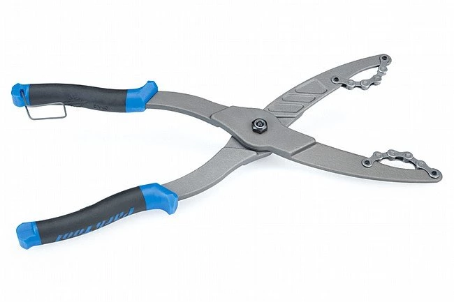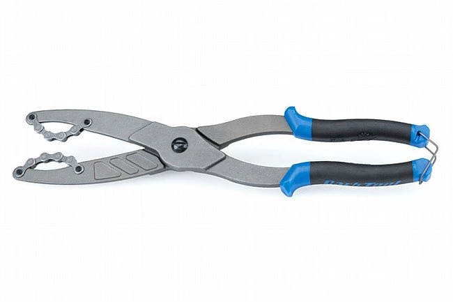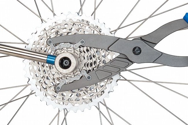 Park Tool CP-1.2 Cassette Pliers quickly grip cogs from 9 to 24 teeth with no manual adjustments. A great shop tool, the CP-1.2 is 13.7″ (35cm) long and can be used with one hand to hold any 7-speed to 12-speed road or mountain bike cassette solidly during lock ring removal. Also compatible with single-speed cassettes with a 3/32″ cog.
