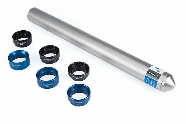 A fresh new approach to crown race installation. Traditionally, a mechanic would slam a tube down onto the bearing surface to “set” the race in place. The CRS-1 offers a different approach that offers faster, safer, and more precise installation. The bearing surface is spared a direct hit by using different inserts to ensure proper fit on the race. Choose the correct insert then slide the tube over the fork tube and into the top end of the insert. Using a hammer, tap firmly on the end cap of the tube and seat the race into its proper place safely and accurately. The CRS-1 set includes one universal setting tube, three 1″ inserts and three 1-1/8″ inserts.