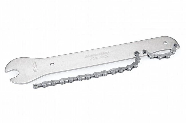 The Park Tool HCW 16.3 Chain Whip combines two handy tools to make bike maintenance easier. It operates as a 15mm pedal wrench and as a chain whip to replace cassettes.