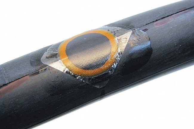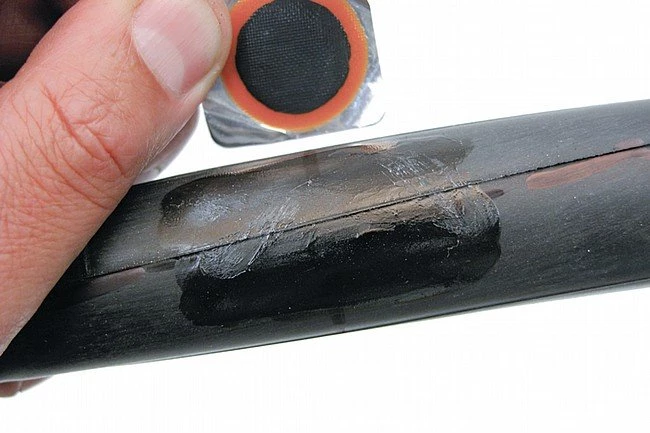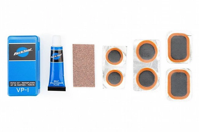 A tube of self-vulcanizing fluid bonds the patch to the tube at the molecular level. Each kit is packaged in a small plastic box with sandpaper for cleaning the tube and instructions.